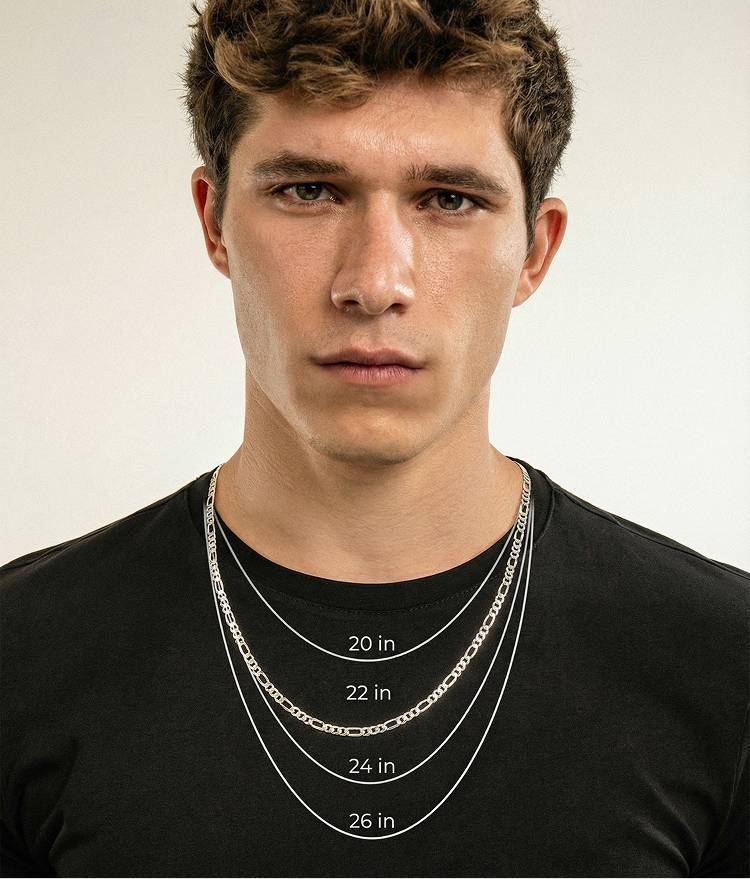 First, measure the size of your neck using a tape measure. This’ll ensure the necklace will fit comfortably around your neck without being too small or big. Once you have your measurement, use it to choose which size is best for you. The most popular necklace lengths are measured in 4 basic sizes: 20”, 22”, 24” and 26".